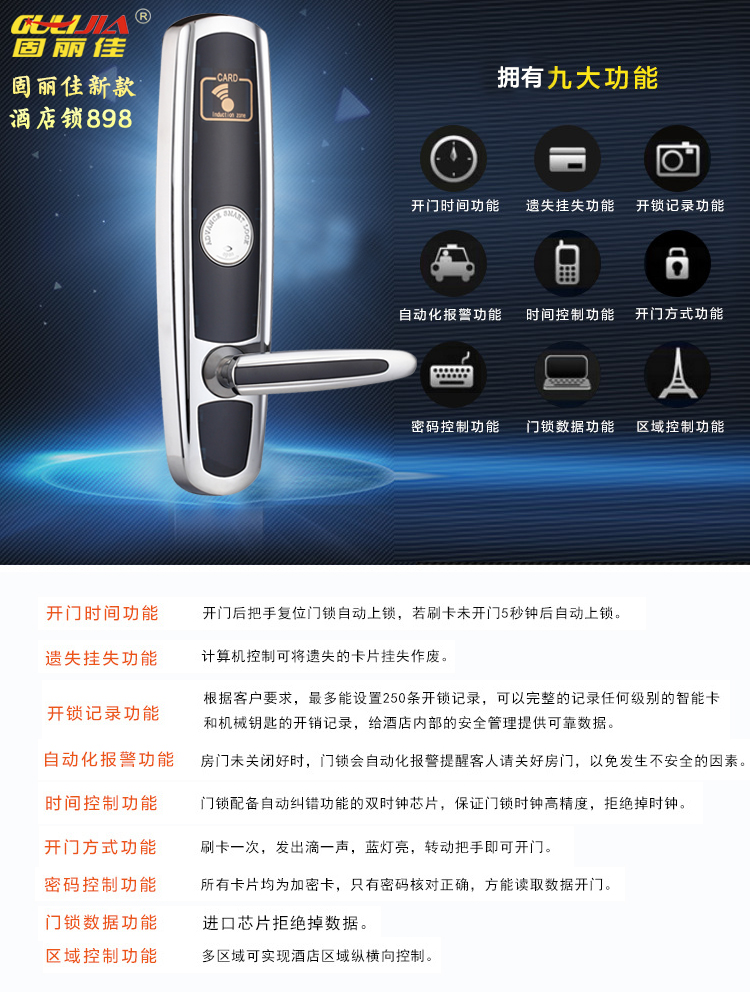 酒店鎖之所以能成為目前暢銷的一個(gè)鎖具,它的功能強(qiáng)大是一種原因,外觀設(shè)計(jì)也是一個(gè)吸引人的重要原因。選擇酒店鎖的人,喜歡的是他精美設(shè)計(jì)的外觀,具有非常時(shí)尚的大氣感,利用感應(yīng)功能,能夠方便開啟,無需攜帶機(jī)械鑰匙。作為日趨智能化的今天,無論是家具,酒店,還是辦公場所大家都在往使用酒店鎖的趨勢上邊發(fā)展,固麗佳致力于讓智能鎖走進(jìn)千家萬戶!